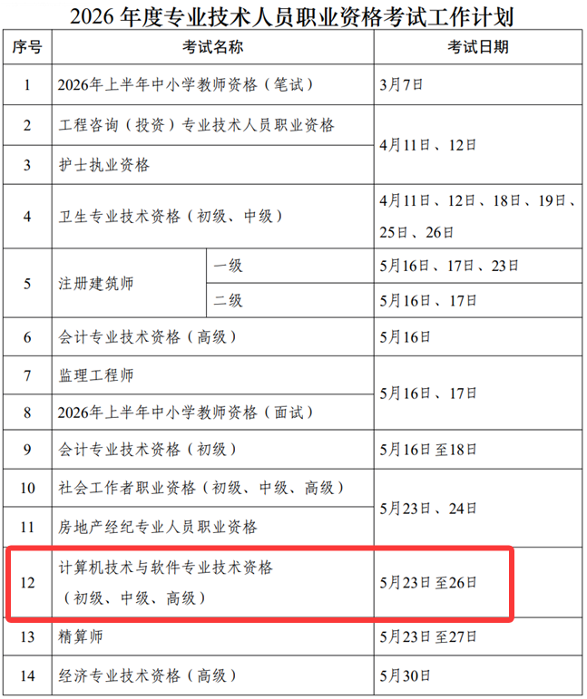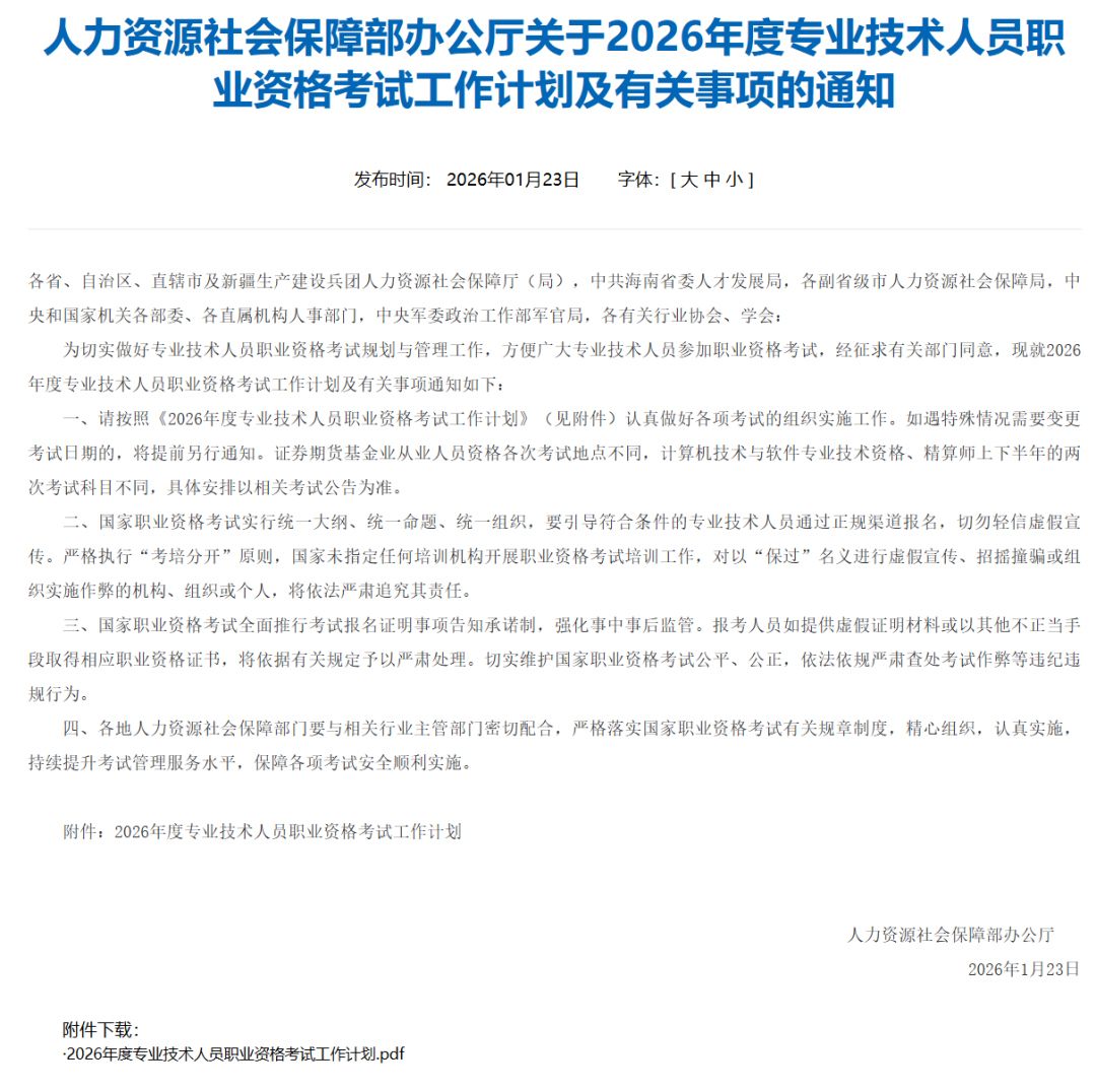 根据人社部**发布的《人力资源社会保障部办公厅关于2026年度专业技术人员职业资格考试工作计划及有关事项的通知》,2026年的软考考试计划终于确定了。