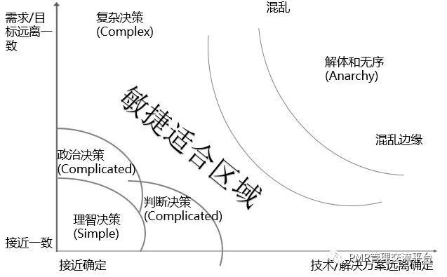 3、需求和技术解决方案两者都不确定,是属于混乱和无序的状态,应用Agile(敏捷)开发模式中的试错和探针等方法可以把这种混乱和无序逐步变成有序,即把项目的状态从史黛西图的右上角拉回到左下角,从混乱变得有序。